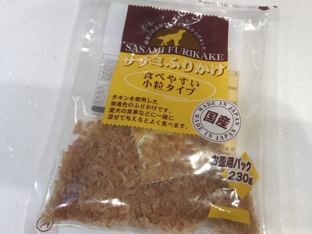 最近は「ささみのふりかけ」をドックフードにまぶしてたべさせていましたが、細かいふりかけだけ拾ってたべて、フードは残すっという徹底ぶりに、ママさん唖然とする毎日(笑)