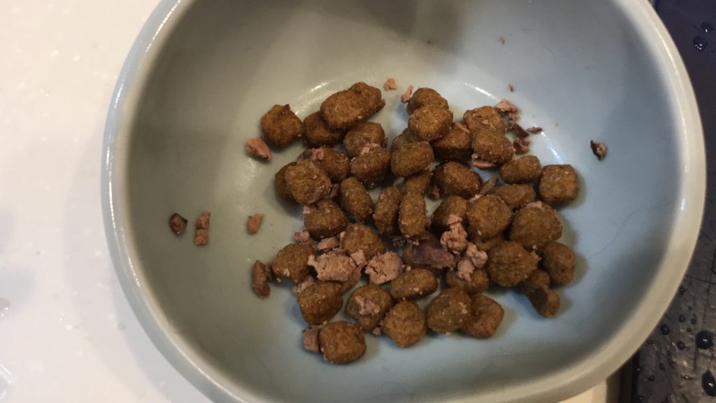 素焼きにした鶏レバーを5グラム程度、フレーク状にしてフードに混ぜてみました。